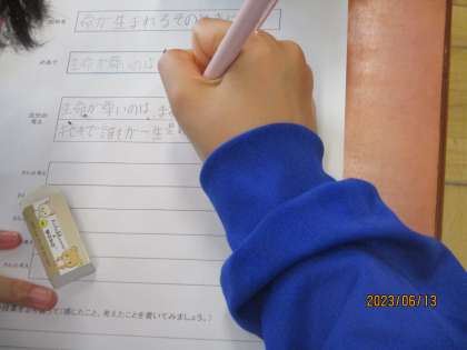6月13日(火) 2年生道徳の授業 公開日 2023/06/13 更新日 2023/06/13 できごと 2年生道徳の授業の様子です。 「生命が尊いのはなぜだろう?」 資料「命が生まれるそのときに」をもとに考えました。