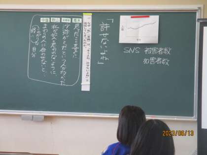 6月13日(火) 2年生道徳の授業 公開日 2023/06/13 更新日 2023/06/13 できごと 2年生道徳の授業の様子です。 SNSのトラブル 「なぜあんなメールを送ってしまったのだろう?」 「あんなメールを返信しなければよかった?」 よくありそうな話です。 資料「許せないよね」をもとに考えました。