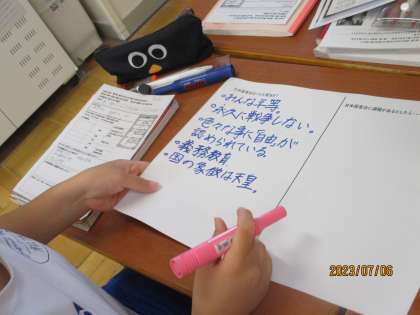 グループに分かれて、憲法の書かれた資料をもとに考えました。