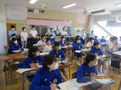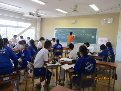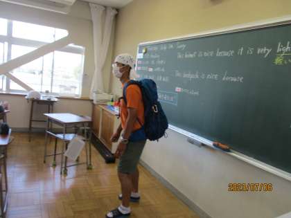 7月6日(木)2年生英語の授業 公開日 2023/07/06 更新日 2023/07/06 できごと 2年生英語の授業の様子です。 なにやら、バックパッカーが登場。 この人がもっているリュックサックがとてもよい(ナイスな)ものらしい。 それはなぜなのか? 実際にリュックの機能を解説しながら、よさをアピールしていました。 今日の授業は「〜だから」理由を表す「Becauce」を使った表現の仕方について、学んでいました。楽しみながら印象に残る授業でした。
