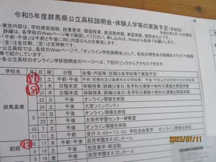 7月11日(火) 3年生進路 公開日 2023/07/11 更新日 2023/07/11 できごと 3年生のフロアの掲示板には、進路情報がズラリ。 夏休み中に行われる高等学校の学校説明会の案内が所狭しと掲示されています。 期日や申込み締め切り日等をよく確認して、着実に準備を進めて欲しいと思います。 頑張れ、3年生!これからが勝負です!!