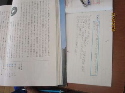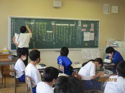 7月12日(水) 1年生国語の授業 公開日 2023/07/12 更新日 2023/07/12 できごと 1年生国語の授業の様子です。 「比喩で広がる言葉の世界」 「比喩とは?」を探るために段落に小見出しをつけよう。 生徒は、自分でつけた段落ごとの小見出しを、次々に発表し先生がそれを板書にまとめていました。黒板の右下に貼られた発言のルールに従って、生徒が主体的に発言していました。
