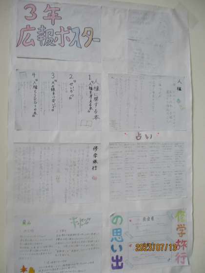 3年生の教室に向かう階段踊り場の壁に、広報委員の人たちが作成した広報ポスターが掲示されていました。