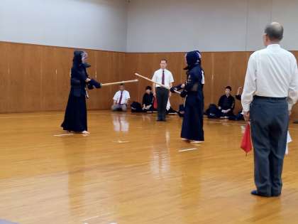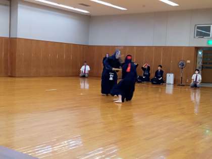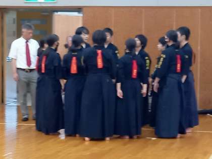 先鋒から一本勝ちで勢いにのり、安定した戦いぶりで勝利を収めました。県大会出場決定おめでとう。このあと、男女の個人戦がおこなわれます。