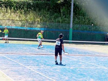 庚申山テニスコートでは、炎天下、猛暑、酷暑のなか、男女のソフトテニス団体戦が行われました。