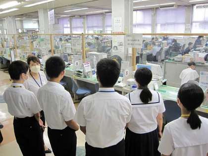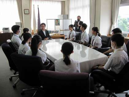 3人の生徒が市役所各課でお世話になって働いています。今日は、市有施設の見学の予定ですが、始めに市長室で藤岡市長さんとの懇談がありました。生徒は自己紹介をしたあと、市長さんに質問をし市長さんから一人ひとりに丁寧な回答をしていただきました。生徒は、働くことややりがいについての考えを深めていました。その後、施設見学をさせていただき、藤岡市の住民の生活を守るため、多方面にわたる部署があることを認識しました。