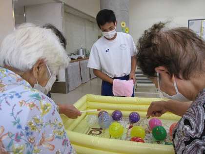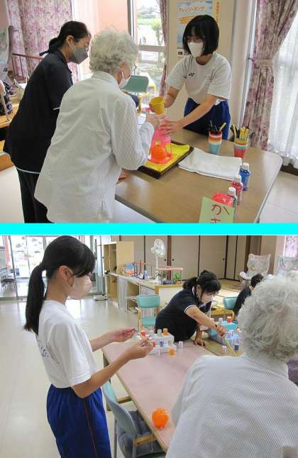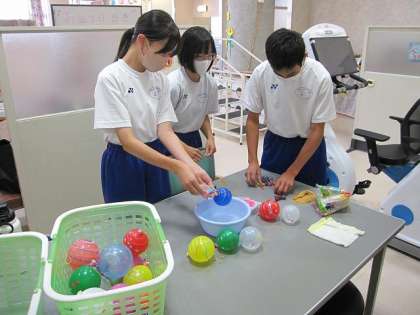 2年チャレンジウィーク(高齢者自立センター藤岡) 公開日 2023/09/06 更新日 2023/09/11 2年・チャレンジウィーク 3人の生徒が高齢者自立センター藤岡で働かせていただいています。今日は利用者さんに楽しく過ごしていただくための「夏祭り」企画がありました。夏祭りを楽しんでもらうためのヨーヨーを3人でつくり、「ヨーヨーつり」「射的」「かき氷」の3つのコーナーを3人がそれぞれ担当して利用者さんに楽しんでもらうことができました。