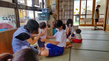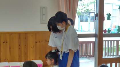 ナースリープレスクールでは、着替えの仕方も教えていただき実際にやってみました。園児の様子を見て手助けをする姿も見られました。
