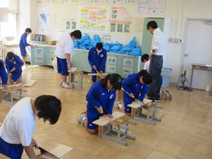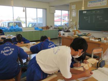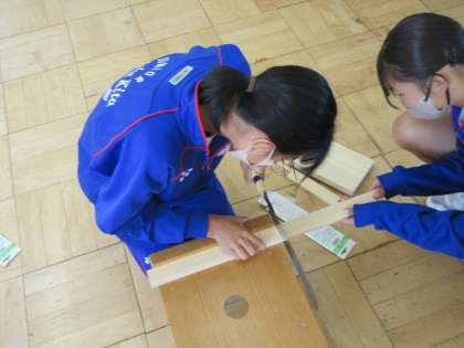 10月12日(木) 1年生技術科の授業 公開日 2023/10/12 更新日 2023/10/12 できごと 1年生技術科の授業(技術科室)の様子です。 今日は、棚付き本立て(木工)の制作に取りかかっていました。 めあては、ズバリ、「材料を正確に切断しよう」です。 まずは、木の長さを測り、のこぎりをひく線を書きます。 線が引けたら、いよいよのこぎりで切断です。 のこぎりの使い方を正しく理解して、レッツ・トライ!