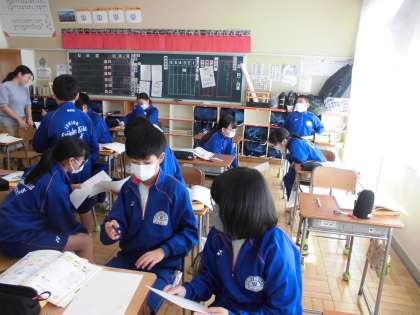 10月13日(金) 2年生家庭科の授業 公開日 2023/10/13 更新日 2023/10/13 できごと 2年生家庭科の授業の様子です。 今日のめあては「食品の安全を守る方法を知ろう」 この後に予定している調理実習の際に、食中毒等を起こさ内容にあうるためには、どうしたらよいか?これまでの経験や知識を生かして自分の考えをまとめ、席の近くの人と共有していました。楽しい調理実習ですが、今日の授業を生かして、食の安全を踏まえたメニューづくりなどの準備を進めてください。