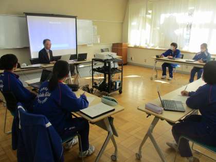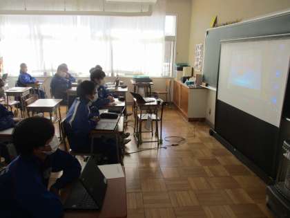 インフルエンザの感染予防のためオンラインで会議室と教室を繋いで、行われました。