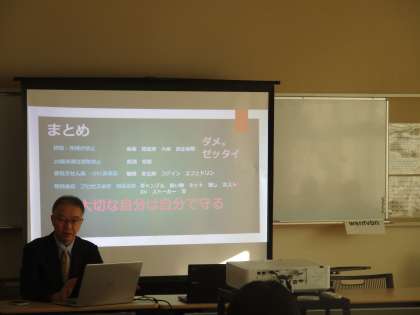 市内の学校薬剤師の先生に講師をお願いし、今ニュースで話題の「大麻」をはじめとする薬物や依存症の恐ろしさ、比較的身近にあるアルコールとたばこの害、自分の命や自分自身のこれからの未来を守る方法について、丁寧に教えていただきました。