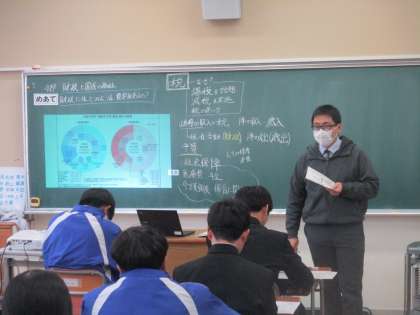 1月11日(木) 3年生社会科の授業 公開日 2024/01/11 更新日 2024/01/11 できごと 3年生社会科の授業の様子です。 「財政と国民の福祉」 今日のめあては、「財政にはどのような役割があるのだろうか?」 財政の役割,国民が納税の義務を果たすことの大切さと租税の種類や役割について考えました。