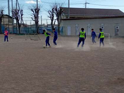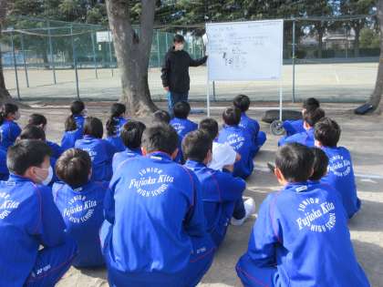 1月15日(月)4時間目に、校庭では、今年教員になったばかりの先生が保健体育(サッカー)の研究授業を行い、校内の先生方が参観しました。
