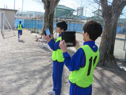 生徒は、自分のチームの動きの分析をするために、ゲーム中の様子を画像でとりながら、進めていました。球技はボールがない時の動きが大切です。それをいかに自分で考えて動けるか。なかなか奥が深いですね。