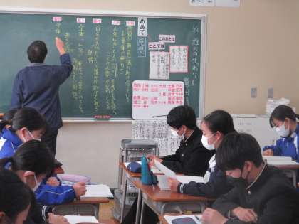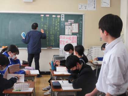 1月16日(火) 3年生国語の授業 公開日 2024/01/16 更新日 2024/01/16 できごと 3年生国語の授業の様子です。 鷲田清一氏によって書かれた説明文「誰かの代わり」 今日は、まず本文を読んで形式段落を確認した後で、根拠をもとに感想をまとめました。 その後、席の近くに人たちと内容を確認し合い、全体で共有しました。