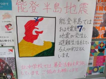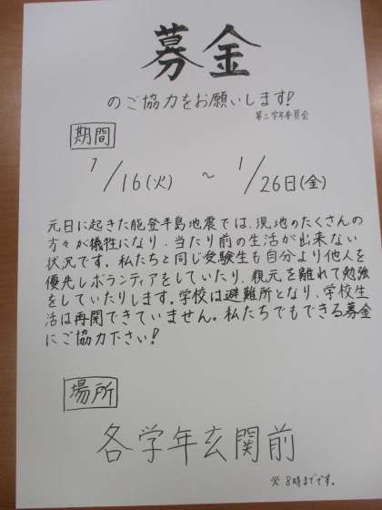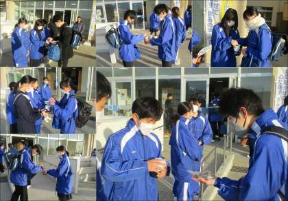 1月18日(水)、今朝も能登半島地震被災地支援募金を登校時に玄関前で行いました。