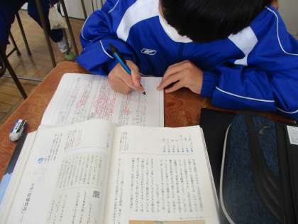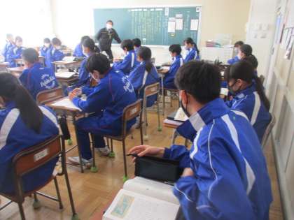 1月19日(金) 1年生国語の授業 公開日 2024/01/19 更新日 2024/01/19 できごと 1年生国語の授業の様子です。 今日の授業では、いよいよまとめに入ります。 「竹取物語」は何を伝えようとしているのか? 一人一人がよく考え手、意見発表していました。 最後には、授業の振り返りをノートに書き留めていました。