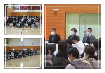 1月24日(水) 新入生説明会 1 公開日 2024/01/24 更新日 2024/01/24 できごと 今日は、4月に入学する小学6年生が来校しました。保護者の方の隣に座る小学生の皆さんの表情には、緊張の中にも、中学校生活に向けた意欲や希望が感じられました。 新入生には、残された小学校生活を充実させて、最上級生としての誇りを持って卒業証書を受け取り、そして、行動力とやる気を蓄えて、北中に入学してきてくれることを期待しています。