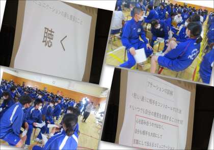 2月20日(火)1,2年生は期末テストが終わった午後、アサーション講習会を行いました。今年度、藤岡市より人権教育実践推進校の指定を受けている本校では、友達関係を円滑にしていくため、これまでにアンガーマネジメントやソーシャルスキルなどについて学んできました。今回は、講師に「NPO法人ぐんまアサーションラボ」理事長の高橋様をお招きして、アサーションについて教えていただきました。