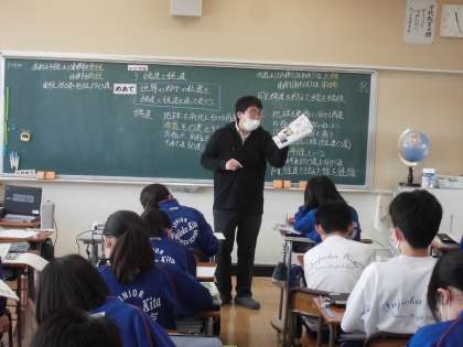 1年生社会科の授業の様子です。 地図帳や資料集などを活用して世界の国々を調べています。