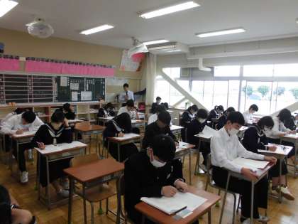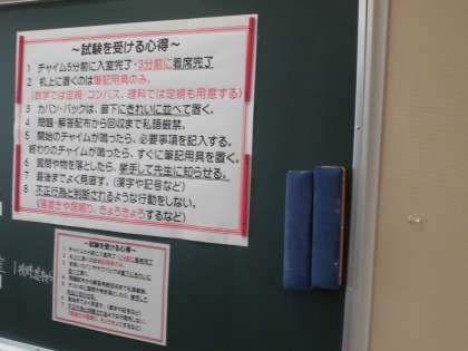 5月8日(水) 3年生実力テスト 公開日 2024/05/08 更新日 2024/05/08 できごと 3年生は実力テストです。 黒板には、「試験を受ける心得」が貼られています。 いよいよ受験生としてのスタートです。 真剣そのもの・・・。 がんばれ3年生!