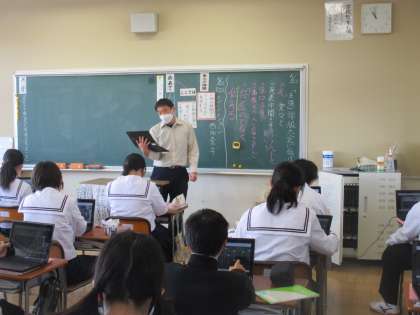5月22日(水) 1年生国語の授業 公開日 2024/05/22 更新日 2024/05/22 できごと 1年生国語の授業の様子です。 今日は登場人物について、本文に即して根拠を元に考える場面です。 つなぎ教材として、他のクラスの様子を写真に撮って、端末で紹介していました。