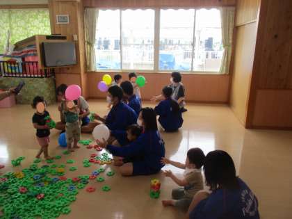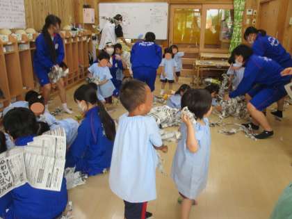 今日は3年5組の生徒達が、1歳児から年長さんまでの各クラスに分かれて、小さな子ども達と触れあいながら、幼児の特性について肌で触れあいながら学んでいました。