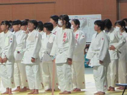 女子の団体戦は3名で戦いますが、北中女子柔道部員は2名で出場しました。つまり、常に相手に1ポイントとられた不利な状態からのスタートです。