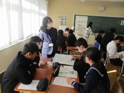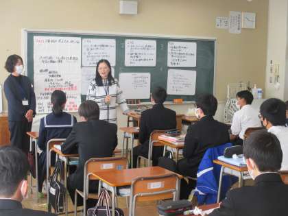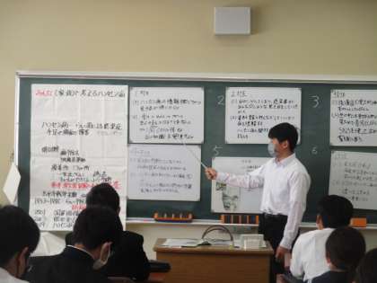 後半は、生徒はグループになって、偏見・差別をなくすためには、「一人ひとりがハンセン病などに対する正しい知識を持つことが大切であること。」「その上で、相手の立場で考えることが大切であること。」「人権を尊重する心を持つことが大切であること。」など、本音で話し合い、全体で交流しました。人権についてじっくり考える機会となりました。