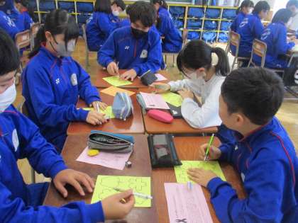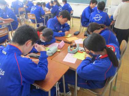 今日の5時間目、1年生と3年生の教室では、学級活動の時間を使って、SHINRAIはあとふるツリー&レッドリボンを作成しました。