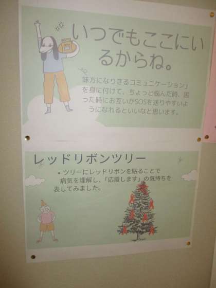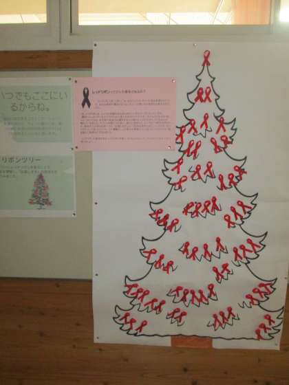 人権集中学習期間である今、レッドリボンの意味を知り、エイズのことを皆さんで考える機会としようと保健委員会では、はあとふるツリー運動にタイアップさせて啓発しています。