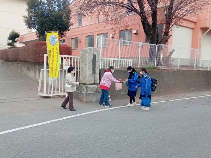 12月11日(水) 薬物乱用防止啓発活動 公開日 2024/12/11 更新日 2024/12/11 できごと 12月11日(水)朝、3つの校門付近では、神流地区民生児童委員さんによる薬物乱用防止啓発活動として、ポケットティッシュ配布とあいさつ運動を行っていただきました。