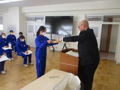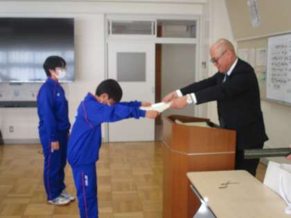 12月11日(水) 表彰式 公開日 2024/12/11 更新日 2024/12/11 できごと 本日昼休みに西会議室で、今年度10回目となる表彰式を開催しました。 各種作文・感想文・標語・ポスター等をはじめ、アンサンブルコンテスト・市民テニス大会・上州藤岡蚕マラソン等の表彰を行いました。 入賞された皆さん、おめでとうございます。
