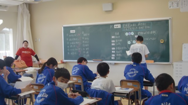今までに習った基本的なイオンの元素記号について振り返ったあと、本時では、イオンが水に溶けると、どのようになるかについて理解を深めていました。授業を参観したときは、塩化銅水溶液を電気分解した様子を表す化学式について検討しているところでした。