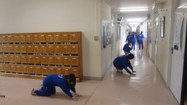 本当によく北中生は掃除をします。今日も、職員玄関から職員室前の廊下では、3年生が黙々と掃除をしていました。ひと通り掃除が終わると、次に「激落ちくん」というスポンジを使って、汚れているところを見つけて、ひたすら磨いています。