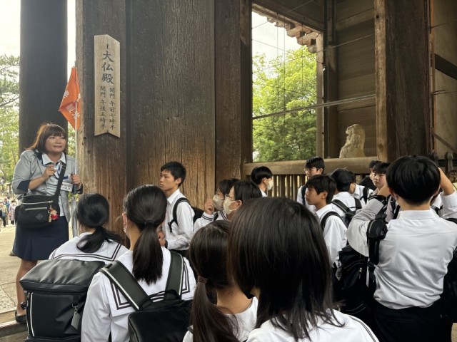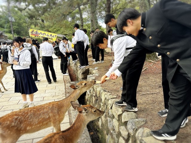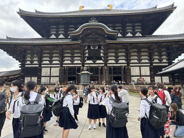 1組 奈良公園&東大寺見学 公開日 2025/05/25 更新日 2025/05/25 3年・修学旅行 東大寺と奈良公園での見学の様子です。大仏の大きさに歓声が上がりました。また、束の間の自由時間では鹿たちと戯れたり、自らが鹿になる生徒も見られました。