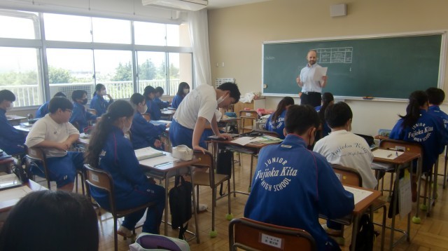 「私は英語が得意です。」「私はギターを演奏します。」「私はたこ焼きが好きです。」「あなたは漫画を読みますか?」「あなたはどんなスポーツが好きですか?」など、今まで学習したことをもとに、ビンゴ形式のゲーム要素を取り入れた学習をしていました。とても盛り上がっていました。