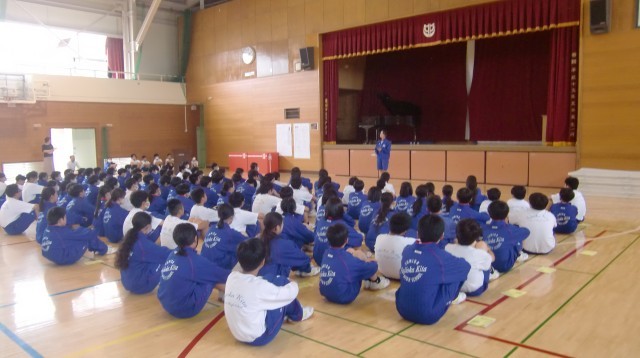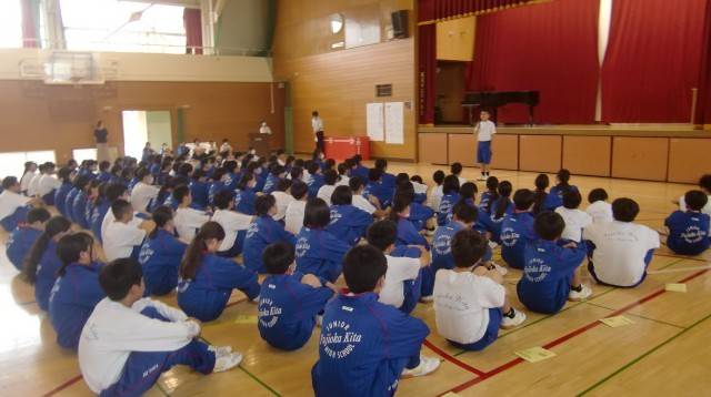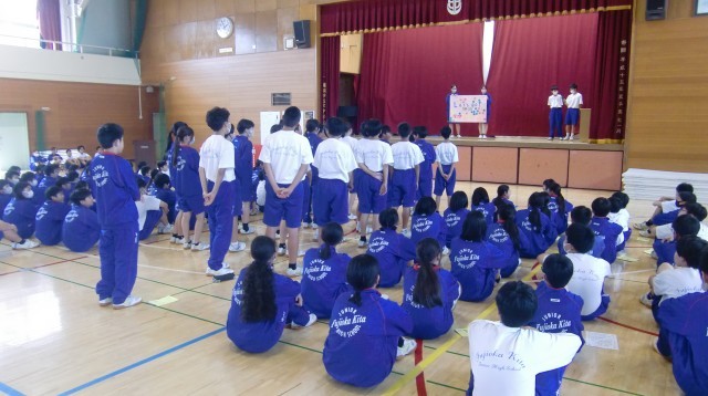 5校時に体育館にて、高原学校の結団式が行われました。代表生徒あいさつでは「晴れることを祈って、この高原学校を楽しみ、いろいろと学んできましょう」と話がありました。また、各クラスによる高原学校への意気込みの発表もあり、大変盛り上がりました。高原学校のスローガンは「Do my best! 彩りの高原 いい夢を持つ姿」です。雨が心配されますが、安全に気をつけ、充実した高原学校にできればと思います。