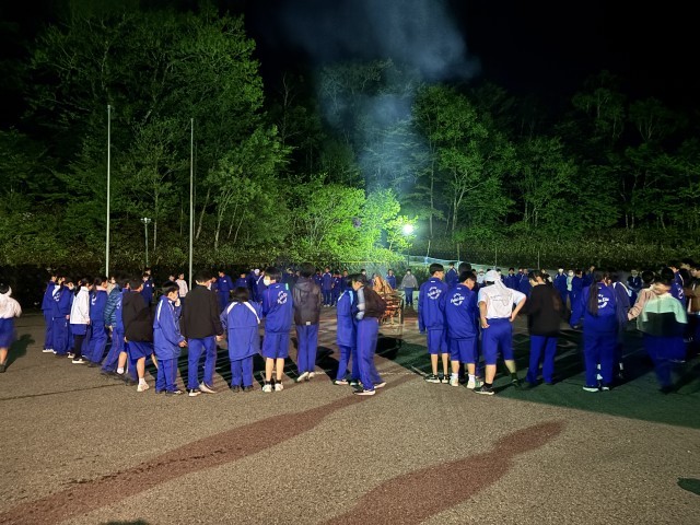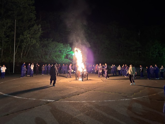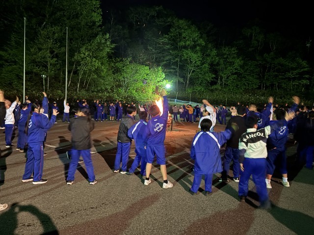 キャンプファイヤー 公開日 2025/05/30 更新日 2025/05/30 1年・高原学校 美味しいカレーを食べた後は、みんなが楽しみにしていたキャンプファイヤーです。実行委員さんのオープニングセレモニーに続いてジャンボリーミッキーを踊ったり、マイムマイムなどをしたりして楽しみました。