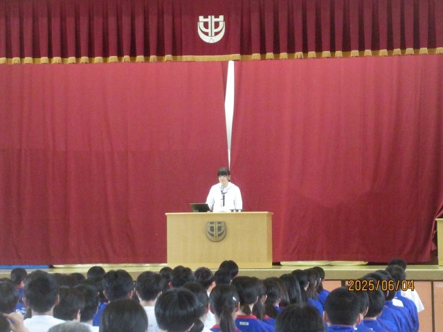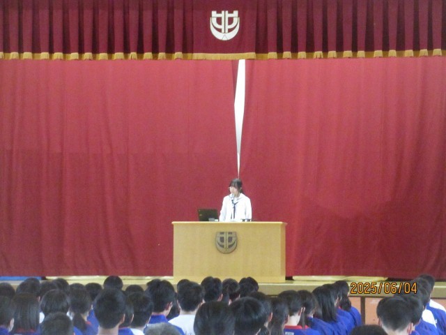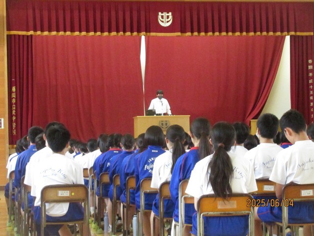 6/4 校内少年の主張大会 公開日 2025/06/05 更新日 2025/06/05 できごと 5・6校時、体育館で少年の主張校内大会が行われ、各学年の代表13名が日頃考えていることや思っていることを積極的に主張しました。また、聞き手は、よりよい生き方、よりよい生活について、発表者の思いを自分事として考えるよい機会となりました。学校代表に選ばれた6名の生徒は、6月28日(土)藤岡市民ホールにて藤岡市大会に出場することになっています。体育祭(球技大会)の翌日になりますが、頑張ってください。
