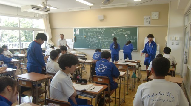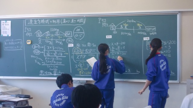 6/17 2年生数学の授業 公開日 2025/06/17 更新日 2025/06/18 できごと 道のりや速さ、時間について、連立方程式を使って求めていました。 黒板にはネームプレートが貼られ、その下に自分なりに考えた連立方程式を書き、説明をしていました。