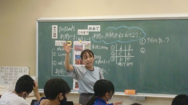 フェスティバル新聞づくりに取り組んでいました。タイトルをALTの先生にチェックしてもらい、各自のペースで原稿を作成していました。