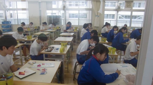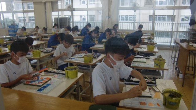 立体感や奥行きを表せるような色合いを考えながら塗っていました。生徒たちは、色合いを考えながら作業に集中していました。