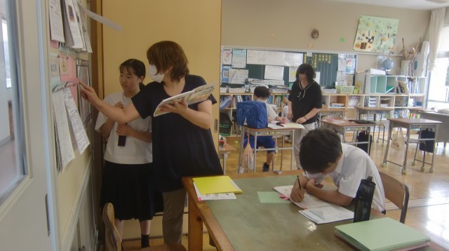 それぞれの課題に真剣に取り組んでいました。社会の学習では、教室内に掲示してある地図を使って位置の確認をしていました。