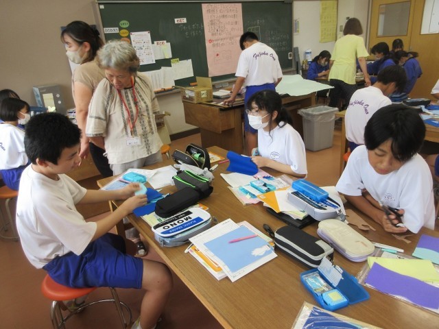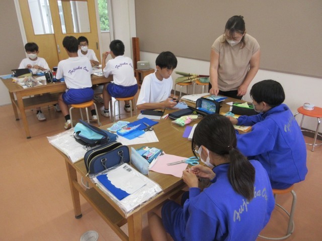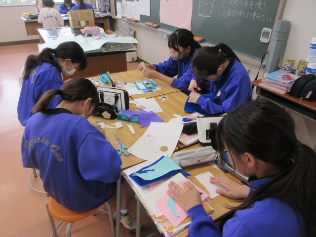 7月15日(火)授業の様子(1年3組 家庭科) 公開日 2025/07/15 更新日 2025/07/15 できごと ウォールポケットのポケットパーツの部分を作成しています。フェルトからポケットのパーツを切り取ったら、ポケットに縫い付けていきます。作業が徐々に細かくなってきました。今日も、おのハンモックの方に支援していただきました。