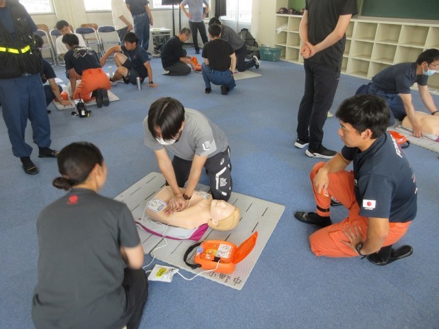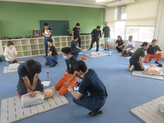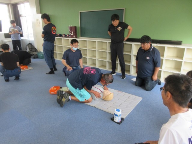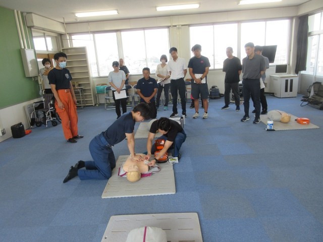 9月1日(月)救急法講習会(職員対象) 公開日 2025/09/01 更新日 2025/09/01 できごと 多野藤岡消防本部より7名の方々を講師に迎え、救急法講習会を職員対象に実施しました。心肺蘇生法実習やAEDの使用方法等について研修しました。実際に使う場面があってはいけないことですが、突然の事故等に遭遇しても慌てることなく適切に応急手当ができるよう、今後も健康・安全に関する研修を積んでいきたいと思います。 +2
