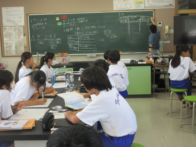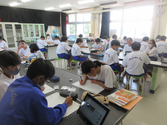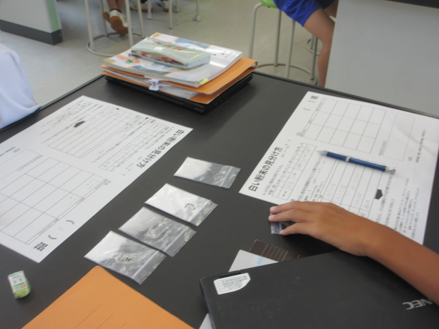 9月2日(火)授業の様子(1年2組 理科) 公開日 2025/09/02 更新日 2025/09/02 できごと 5種類の白い粉を根拠を示して分類します。それぞれの物質の特徴を考えながら、どんなことをすれば特定できるか、ワークシートにまとめていきました。これまで学習したことを活用しながら学習を進めていました。