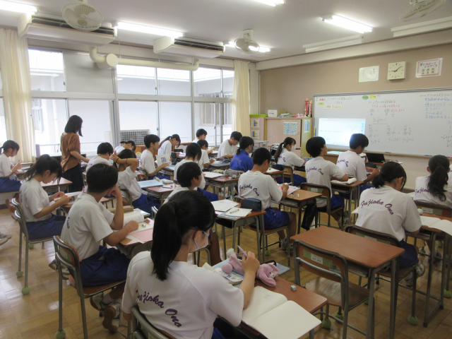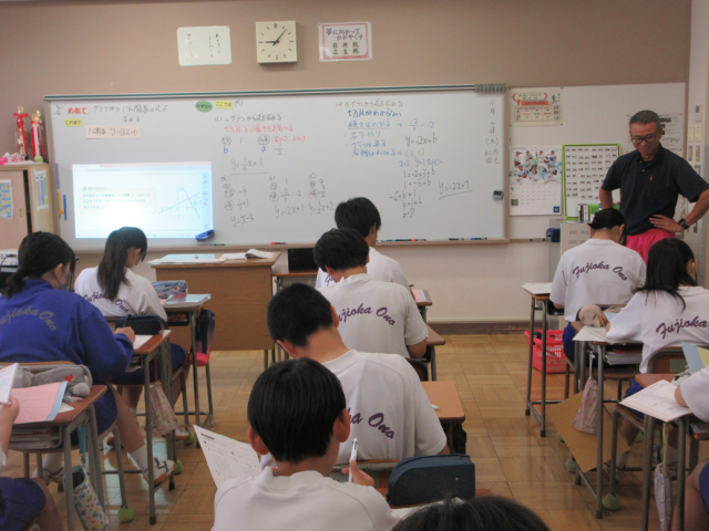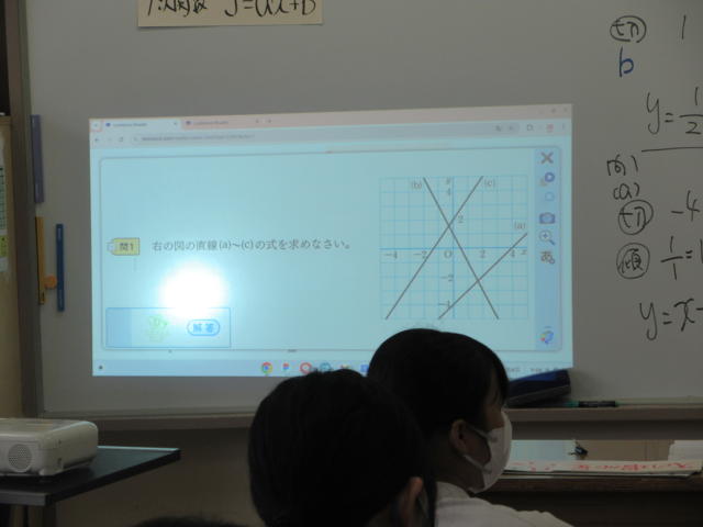 9月4日(木)授業の様子(2年3組 数学) 公開日 2025/09/04 更新日 2025/09/04 できごと 1次関数の学習です。グラフから1次関数の式を求めました。求め方のポイントがあるようです。支援員の先生も授業に入り、助言してくれています。