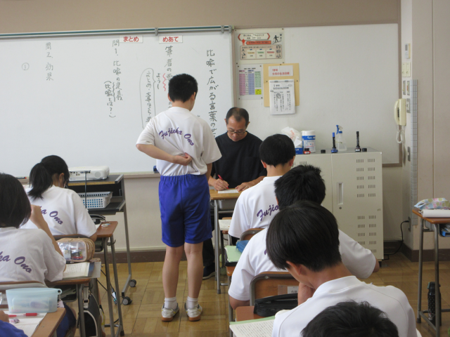 比喩について書かれた教材の文章読解を行っています。直喩や隠喩などの比喩表現を通して、言葉のもつイメージの広がりや文章表現を学んでいきます。今日は、文章の要旨をまとめました。